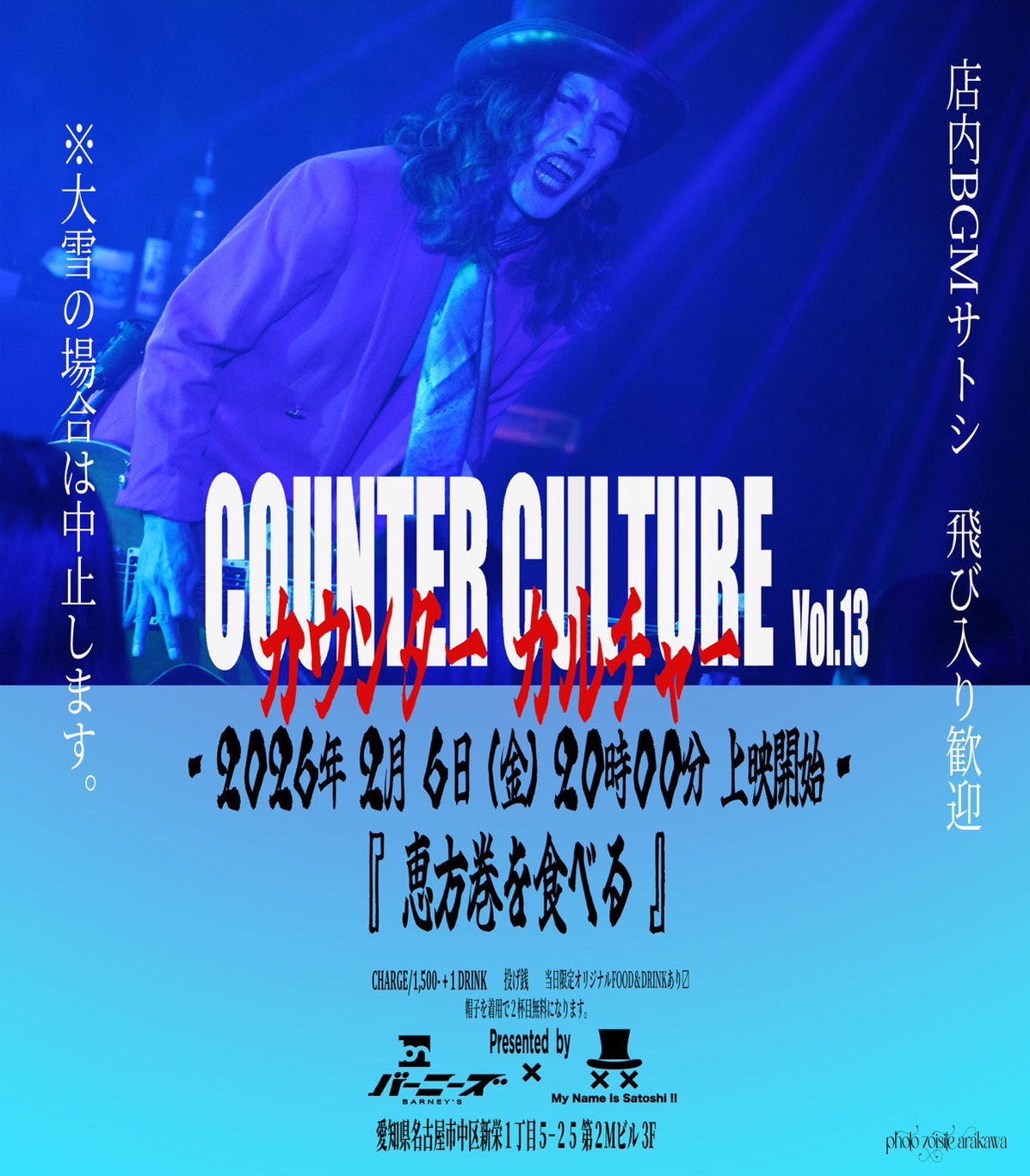 CHARGE/¥1,500+1Drink 投げ銭 当日限定オリジナルFOOD&DRINKあり ※帽子着用でDrink2杯目無料
